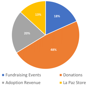 - La Paz Store (13%): Every purchase at our local La Paz store contributes directly to our rescue work. From pet supplies to unique finds, the store serves as a meaningful revenue stream, ensuring funds are continually directed toward our mission.