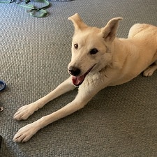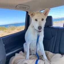 I grabbed my treats and water and slowly approached him. I sat down at his eye level and offered treats.  He took a chance and came closer. As he kept taking treats, I was able to gently grab his collar, snap on a leash.  It didn’t take too much convincing to get him into the car, he sensed that he could trust me, and he was so tired of running from strangers and walking aimlessly trying to find his family.