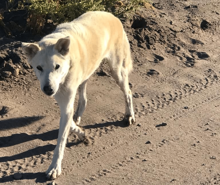 We were on our way to the spay and neuter clinic in El Centenario (just outside of the town of La Paz) when we first saw him. This white Husky mix was walking slowly down the road from the Parisio de Mar golf course on the Mogote (a peninsula in the inner bay of La Paz). He looked lost and a bit disoriented.
